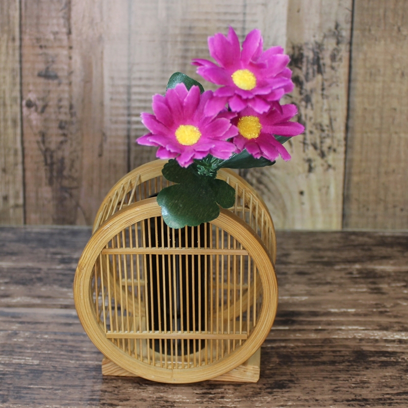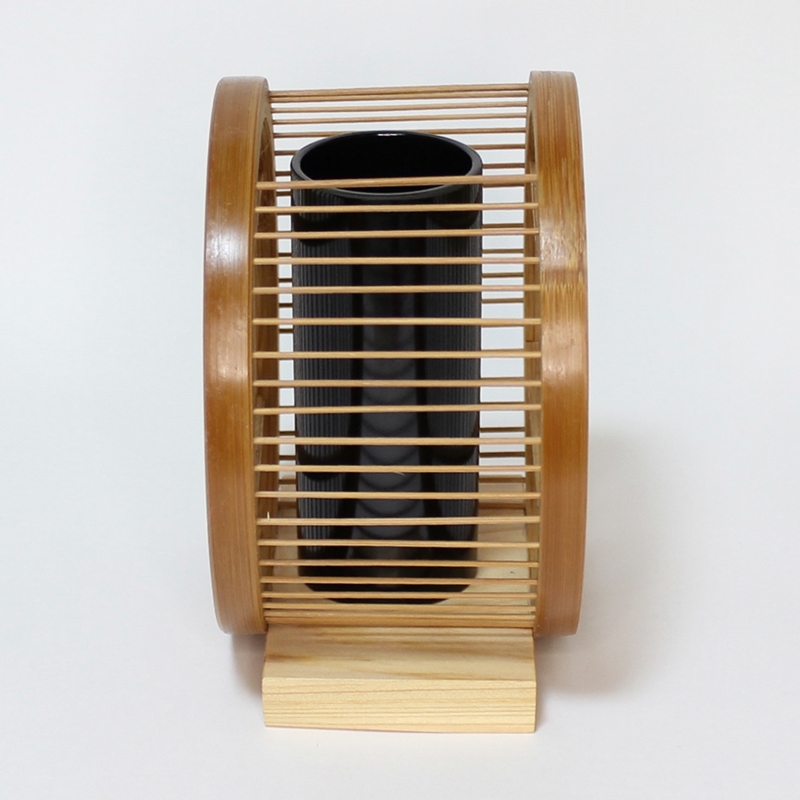 今までの「駿河竹千筋細工」の花器は、縁(丸)を水平に使っていましたが、この作品は、縦に使っているところがおもしろいですね。