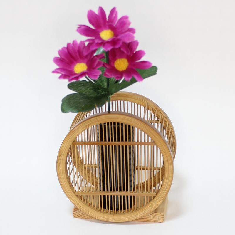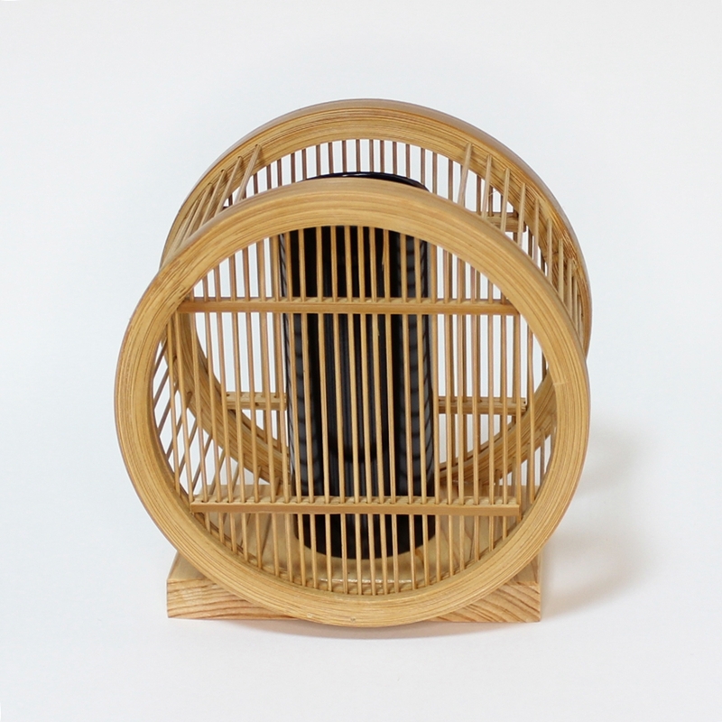 今までの「駿河竹千筋細工」の花器は、縁(丸)を水平に使っていましたが、この作品は、縦に使っているところがおもしろいですね。